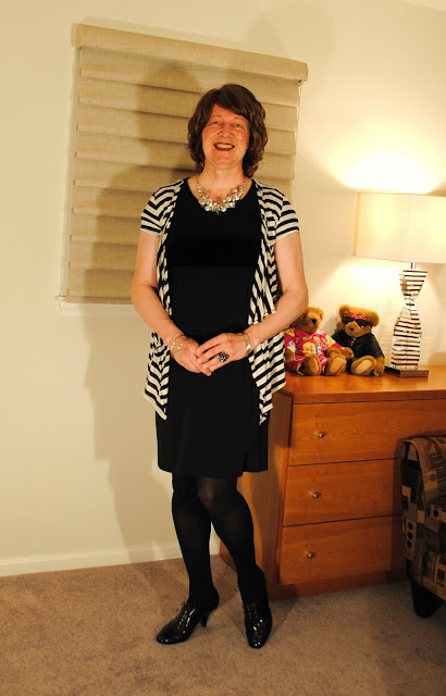 I paired the dress with a striped cardi to give it some graphic interest but, honestly, I prefer the dress by itself. Yes, it is plain but in an elegant way. I'd happily wear it to a fancy party, maybe with a diamond necklace. (We can dream, can't we?!)